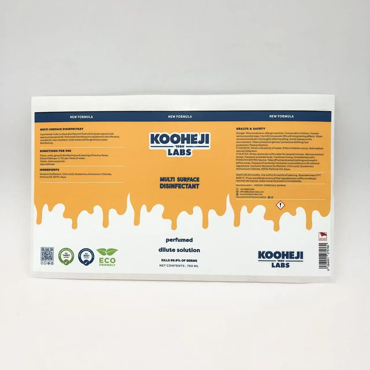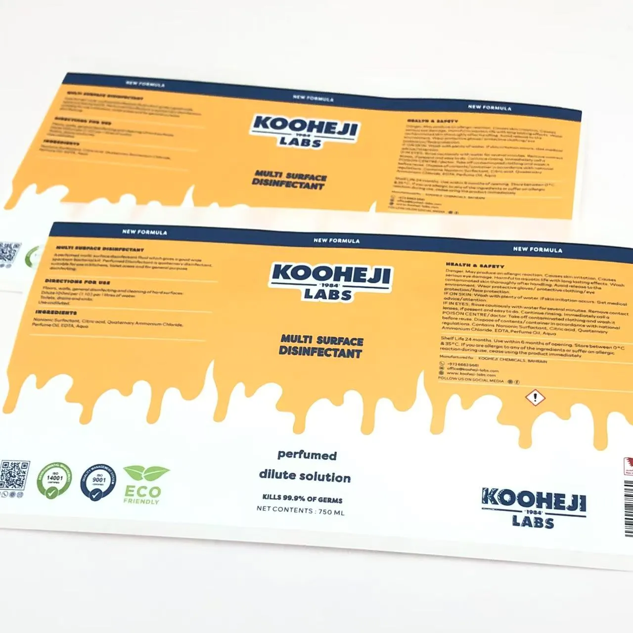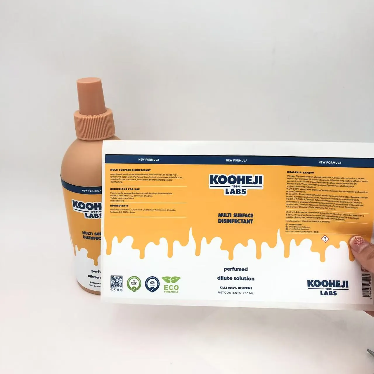 JOJO pakettiharjoittaa syvästi desinfiointiainepullojen pakkausetikettien räätälöintiä, tunnemme desinfiointituotteiden materiaalivaatimukset ja turvallisuusstandardit lääketieteen, kotitalouden, kaupan ja teollisuuden aloilla varmistaen, että räätälöidyt etiketit mukautuvat täysin ankariin käyttöympäristöihin.