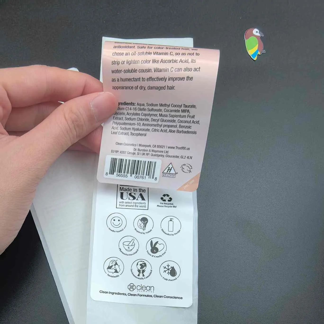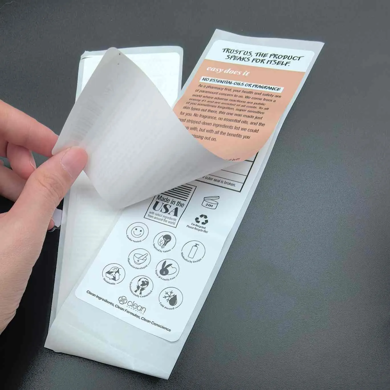 Kuori ja lue tarrat:Yleisin tyyppi, Sitä kutsutaan myös monikerroksiseksi kosmeettisille tarroille. Ylempi kerros on helppo irrottaa ja sisäkerros sisältää laajennettua tietoa. Sitä käytetään usein kasvonaamioihin, seerumeihin ja muihin pienikokoisiin tuotteisiin.