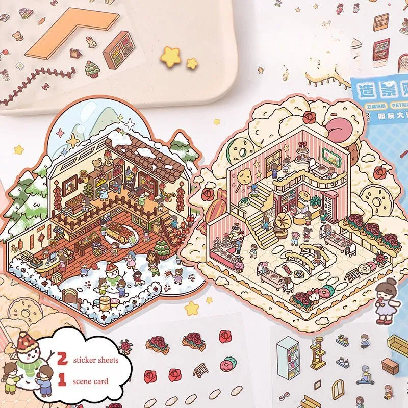 Lapset voivat vapaasti yhdistää erilaisia kohtauksia, kuten keittiön, makuuhuoneen ja puutarhan, rakentaakseen omia unelmamökkejä, aivan kuten rakennus lohkoilla. Tarrat voivat nopeasti lievittää stressiä vuorovaikutteisilla menetelmillä, kuten liitoksella ja pinoamisella.