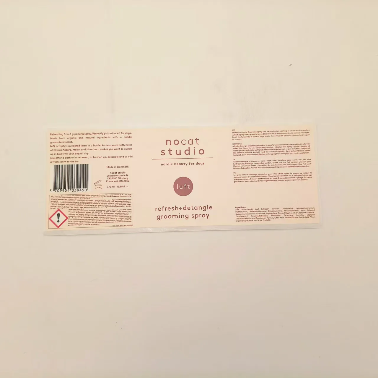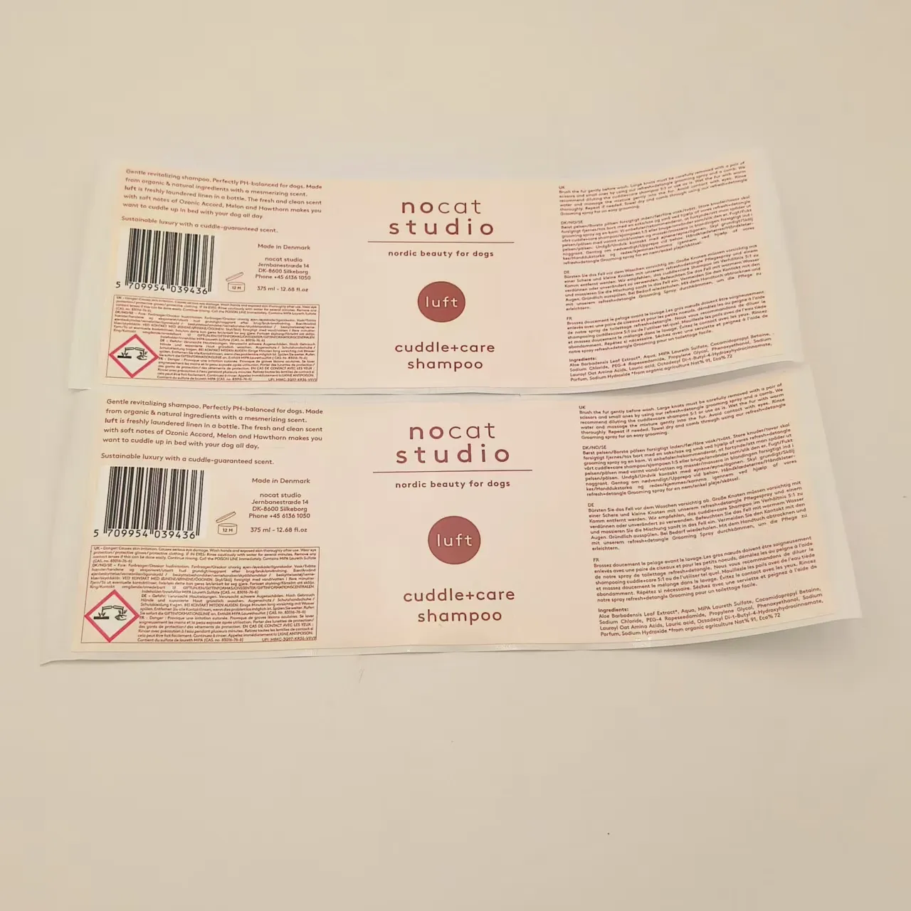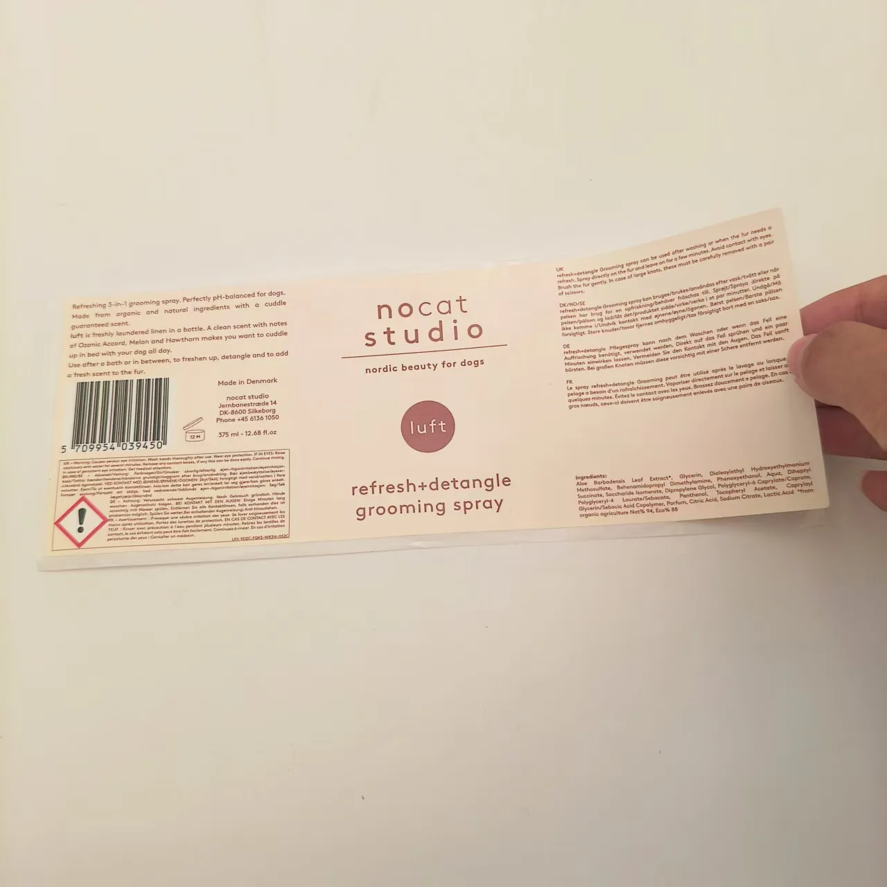 Jojopack Company on erityisesti suunnitellut huippuluokan etikettiratkaisun lemmikkieläinten hoitoaineille. Suihkupullomerkinnät on valmistettu vedenpitävästä ja kyynelkestävästä materiaalista, ja tuotemerkinnät voivat ylläpitää kirkkaana ja kestävän värin jopa kosteassa ympäristössä. Etiketti sisältää tietoja, kuten tuotteenimi, ainesosat, turvallisuusohjeet, toiminnot ja varotoimenpiteet, ja se on järjestetty järjestämällä, mikä auttaa tuotemerkkiä parantamaan sen visuaalista kilpailukykyä.